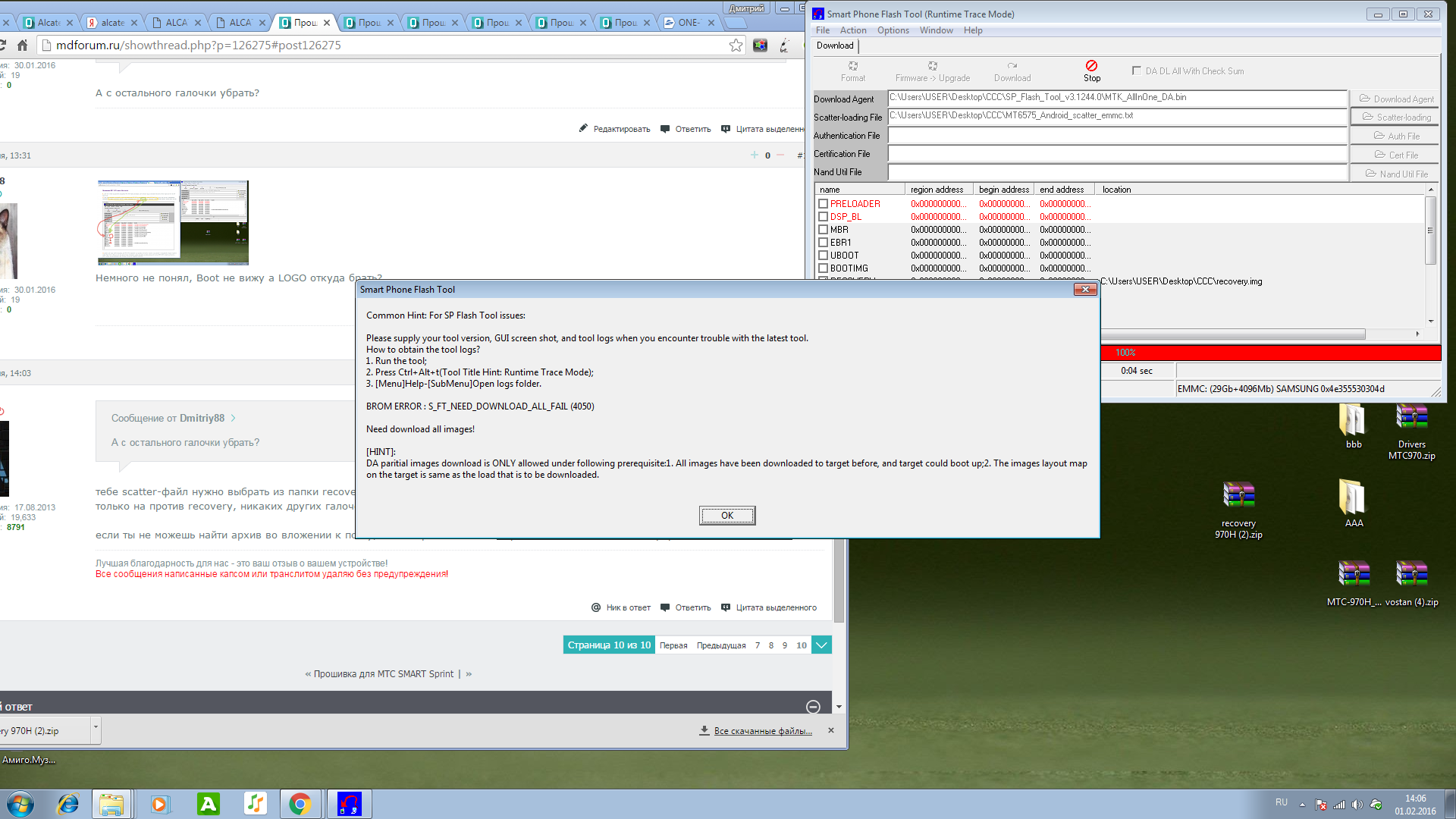 петро 1609, вот даже и не знаю что посоветовать, попробуй отформатировать телефон и прошиться прошивкой от Алкателя, всё как описано в видео, я даже и не знаю, что с твоей ошибкой делать и как её лечить