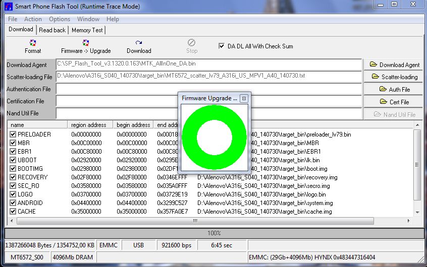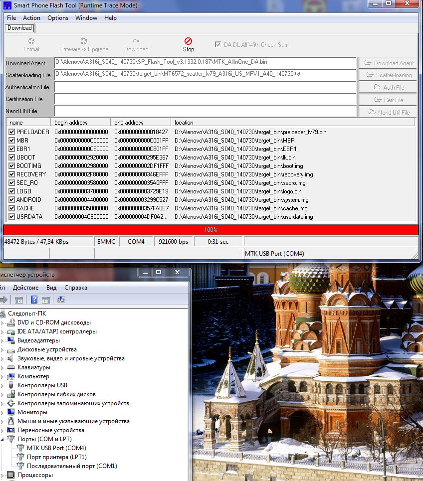3. сразу после этого (как нажал кнопку download, именно после, а не до) подключаешь выключенное устройство, должна пойти прошивка