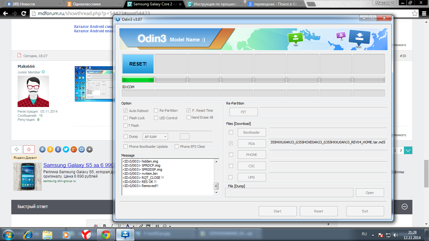 даже хз. может драйвера не установлены, хотя проде бы распознаёт Odin твой аппарат. samsung kies у тебя сейчас установлен? по-идее он все драйвера должен был установить когда сам устанавливался, только во время прошивки программа должна быть закрыта и все процессы завершены. еще тут подумал на счёт отладки по usb, она вроде бы не обязательна даже, так как аппарат все равно находится в режиме download mode во время прошивки.. даже не знаю чем помочь.