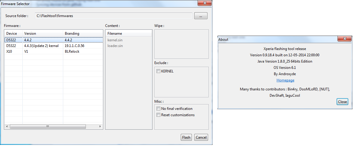 И я прошу прощения , но в посте "Инструкция по прошивке устройства с помощью Sony Flash Tool" (от 09.01.2015, 08:28 Brick Top) для перепрошивки ядра говорится о Sony Flash Tool . Что там можно поставить/снять галочки и т.д.