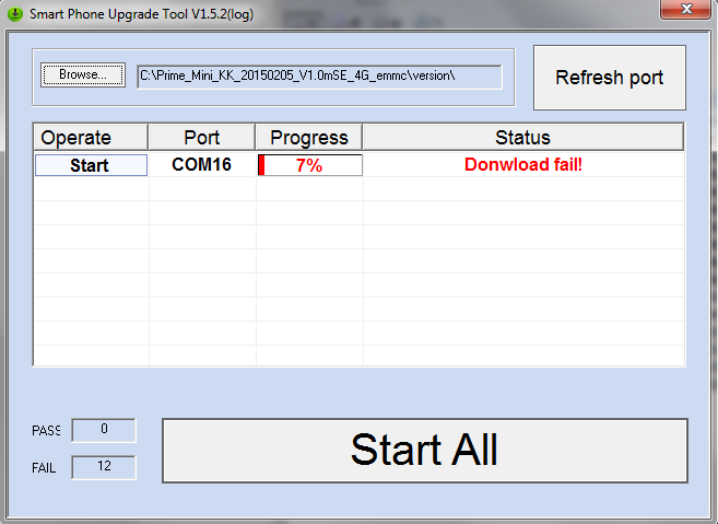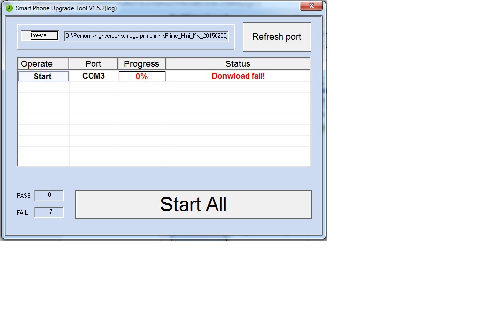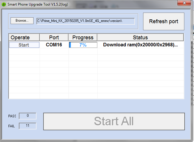 6. Нажмите Refresh Port, в программе определится номер порта, через который будет проходить прошивка, а затем нажмите Start All.