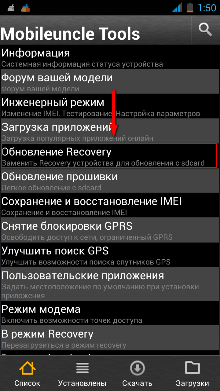 2. запускаешь Mobileuncle, жмёшь Обновление recovery и выбираешь файл recovery.img, соглашаешься с установкой