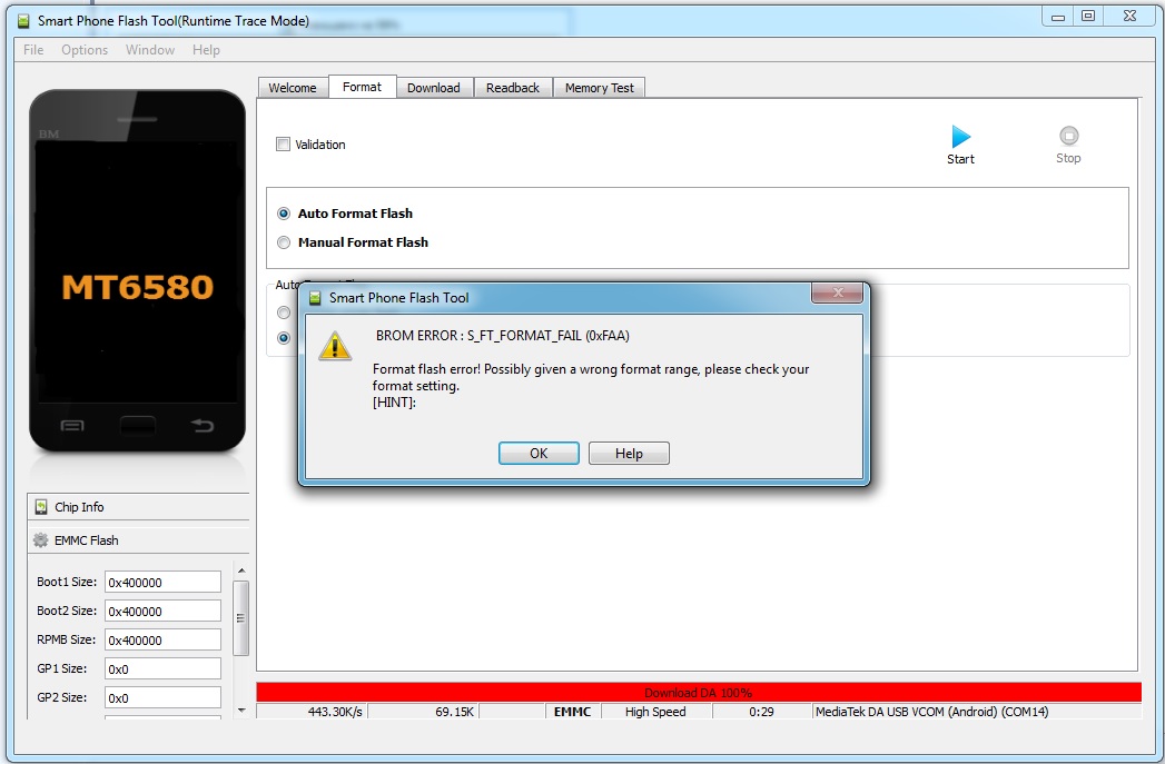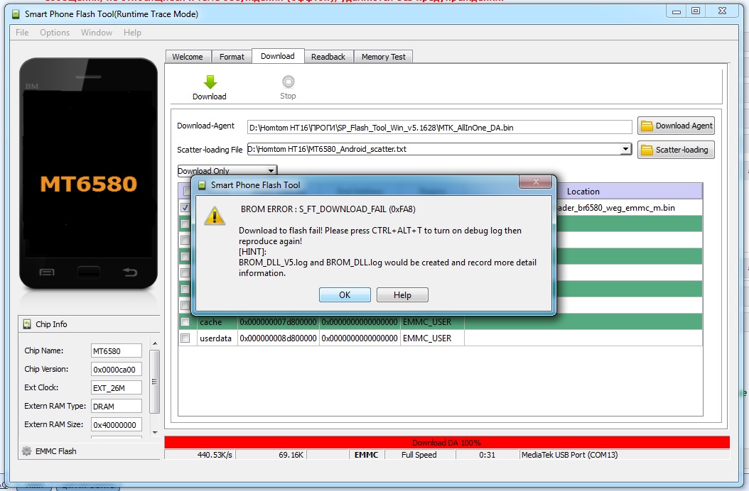 не могу прошит телефон Homtom ht16 флэштулом, подозреваю что проблема в памяти