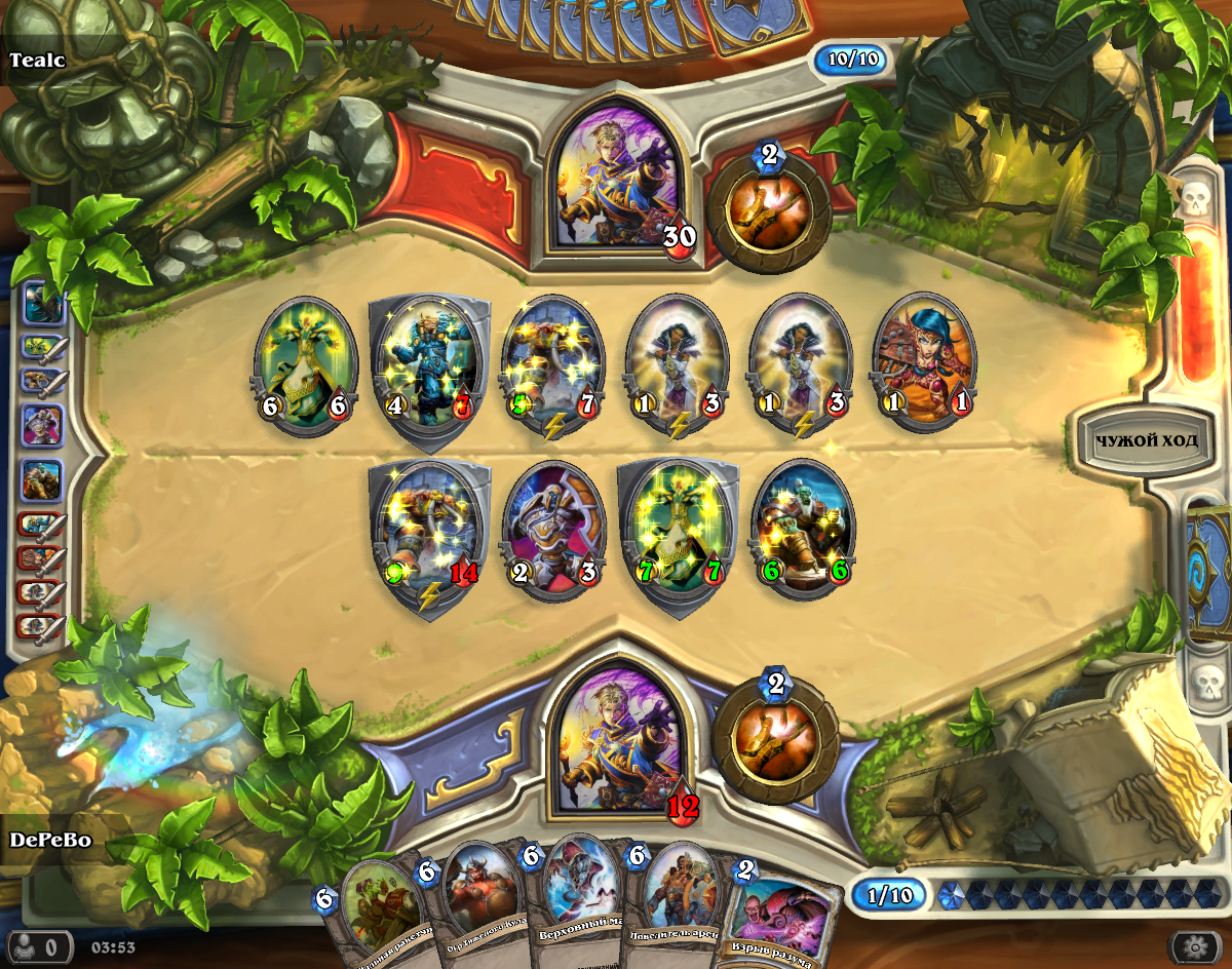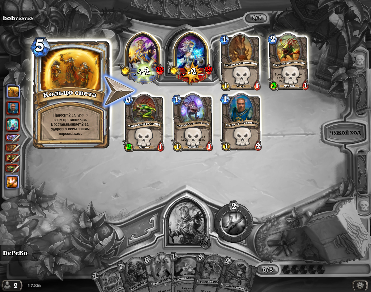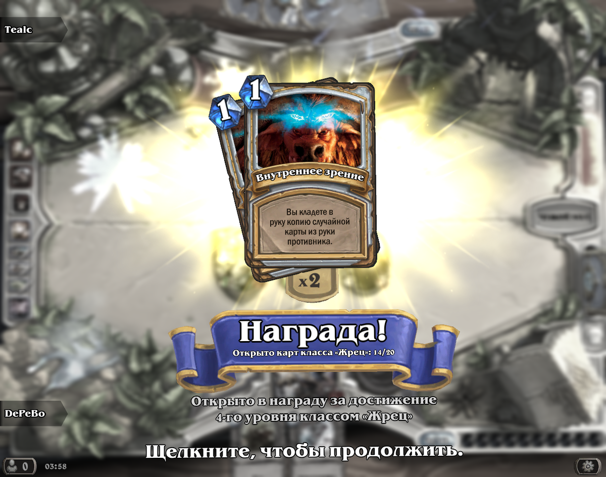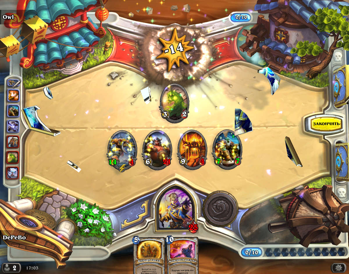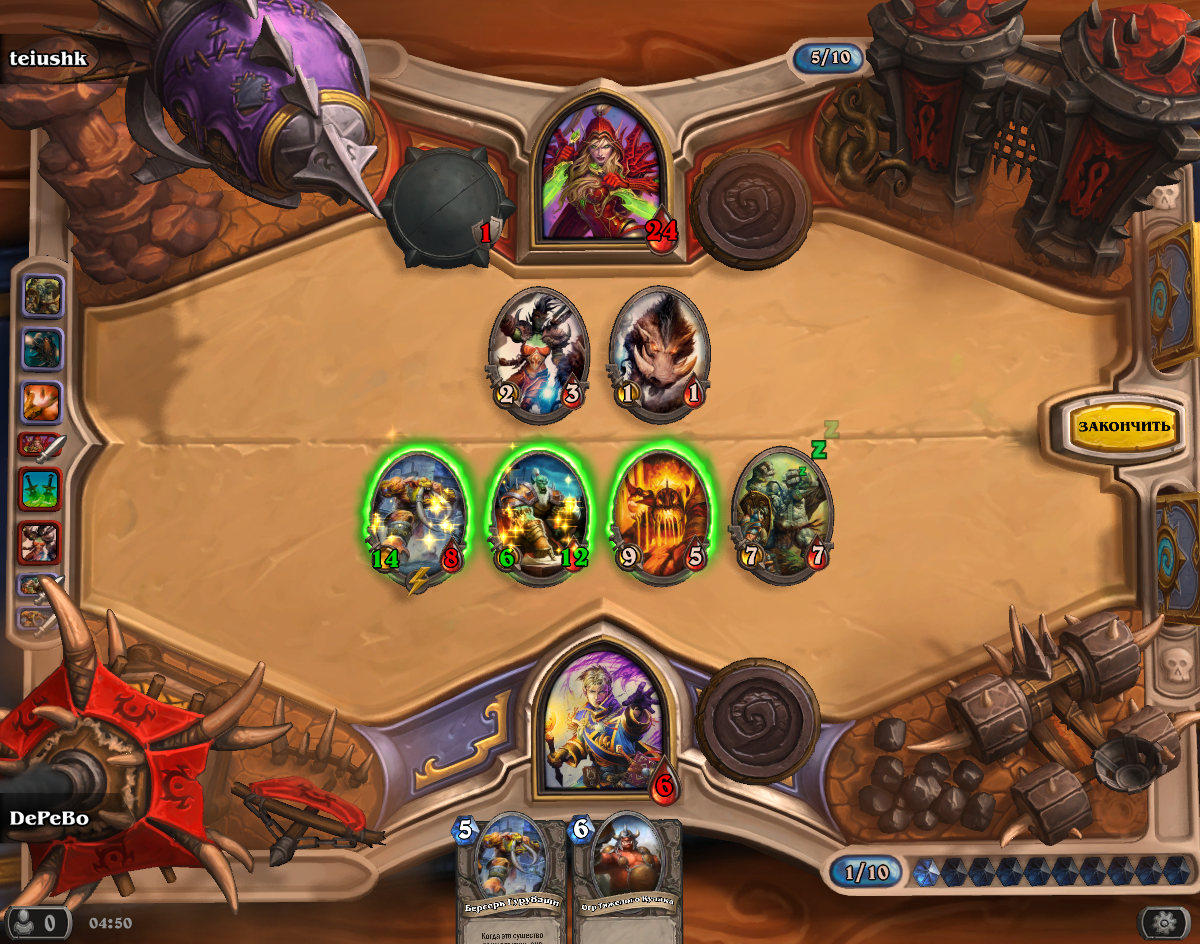 Осваиваю приста)) т.к. дали задание одержать 2 победы жрецом или чернокнижником. Нанёс за 1 ход в первой же игре 21 урон. p.s. прикольно им играть.