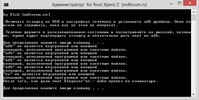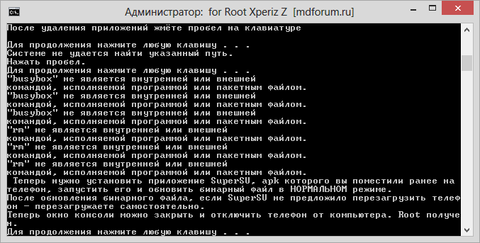 echo Теперь окно консоли можно закрыть и отключить телефон от компьютера. Root получен.