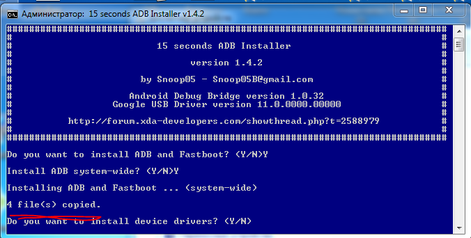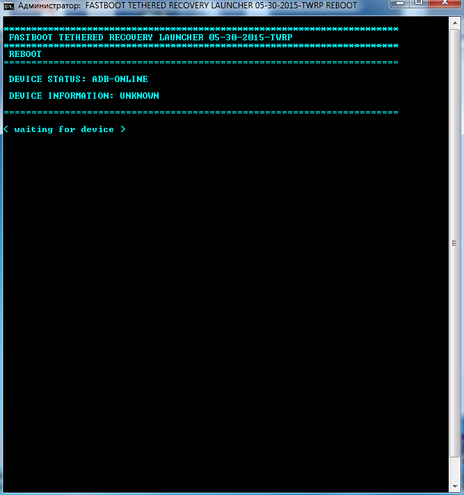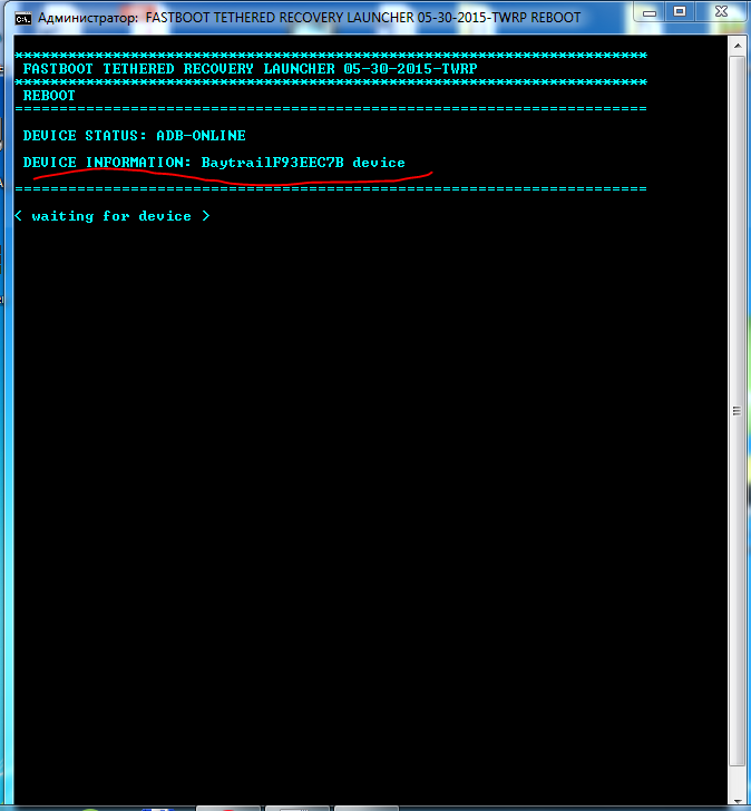 проблема в том, что скрипт не видит устройство после перезагрузки в меню загрузчика, проверьте диспетчер устройств, возможно нужно установить драйвер повторно, в консоли же написано waiting for devices, что означает "жду устройство" и ещё попробуй так:
