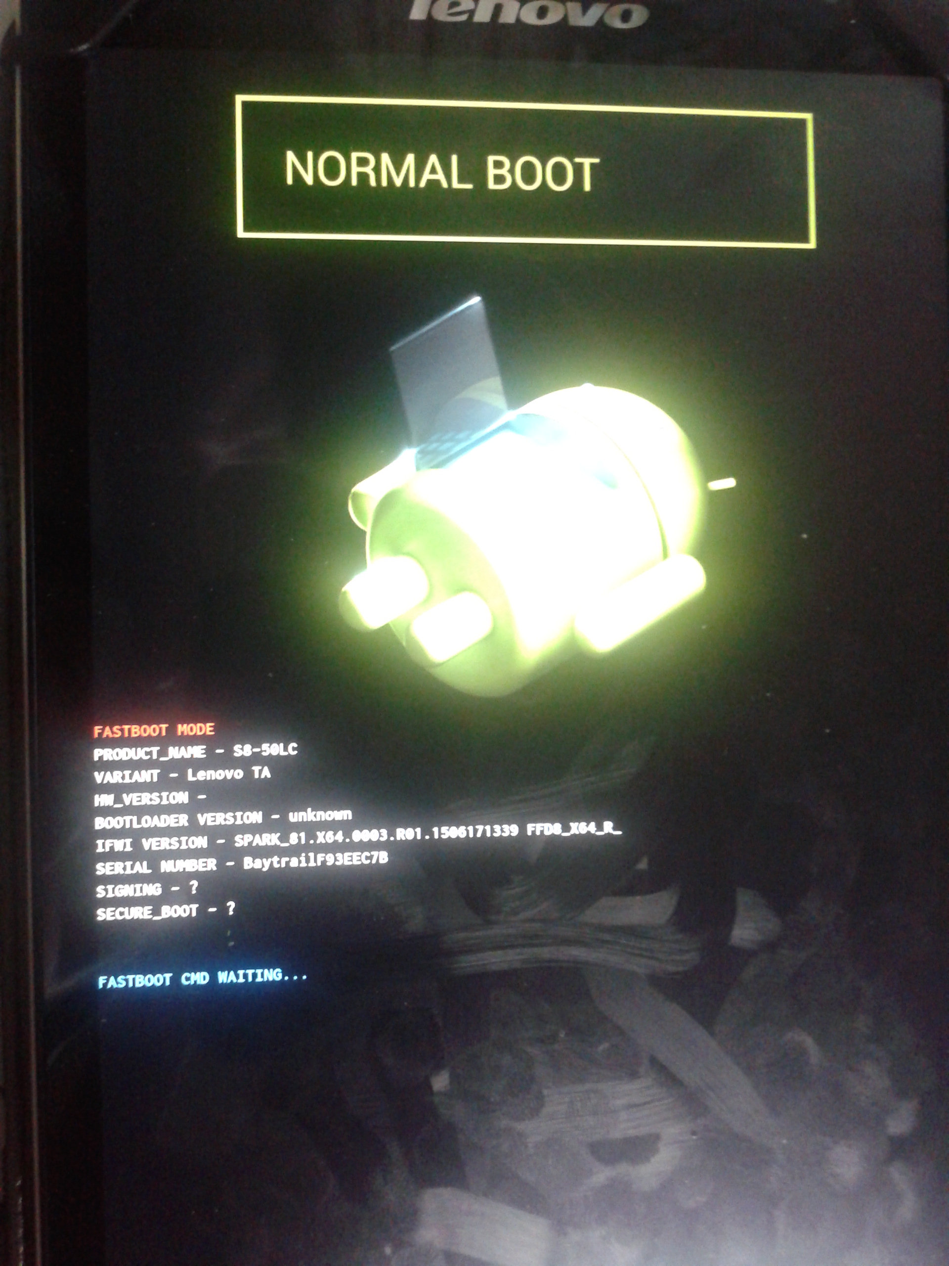 После того как планшет перезагружается появляется экран, и горит зеленым Normal boot. На кнопку уменьшения звука мне выдало 5 "режимов". (5 последних фото ) Укажите пожалуйста куда мне нажимать или укажите ошибку в установке.