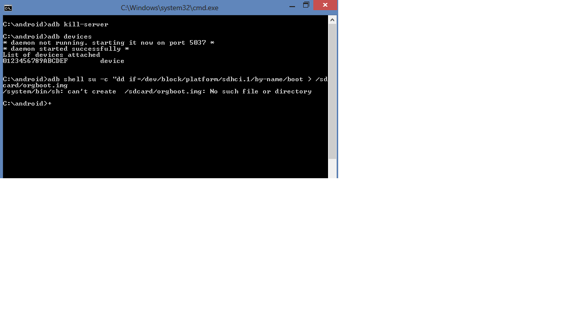 вот а пункт написать сложно? после этой команды adb shell su -c "dd if=/dev/block/platform/sdhci.1/by-name/boot > /sdcard/orgboot.img? что тебе пишет? если waiting for devices, значит проблема в драйверах
