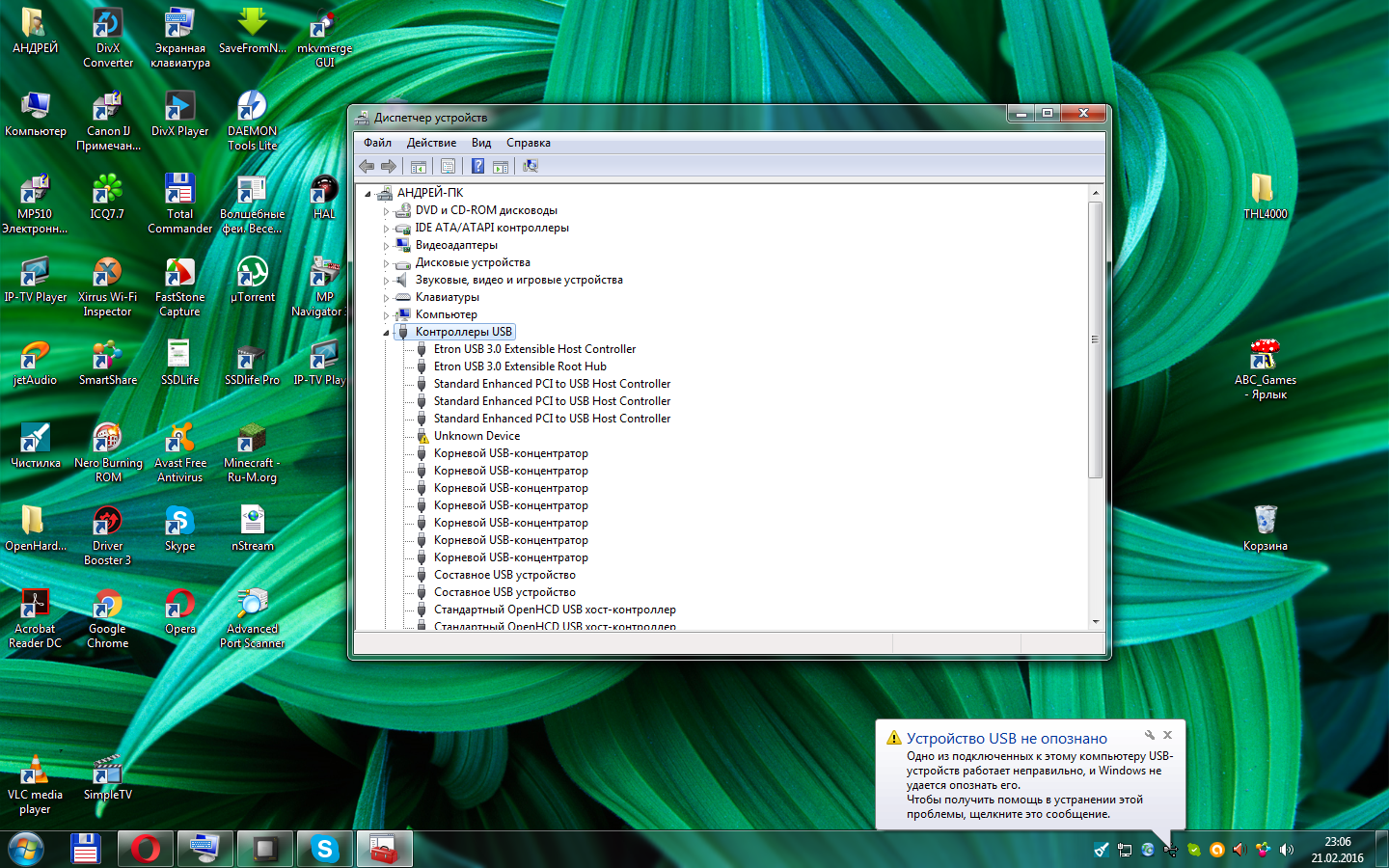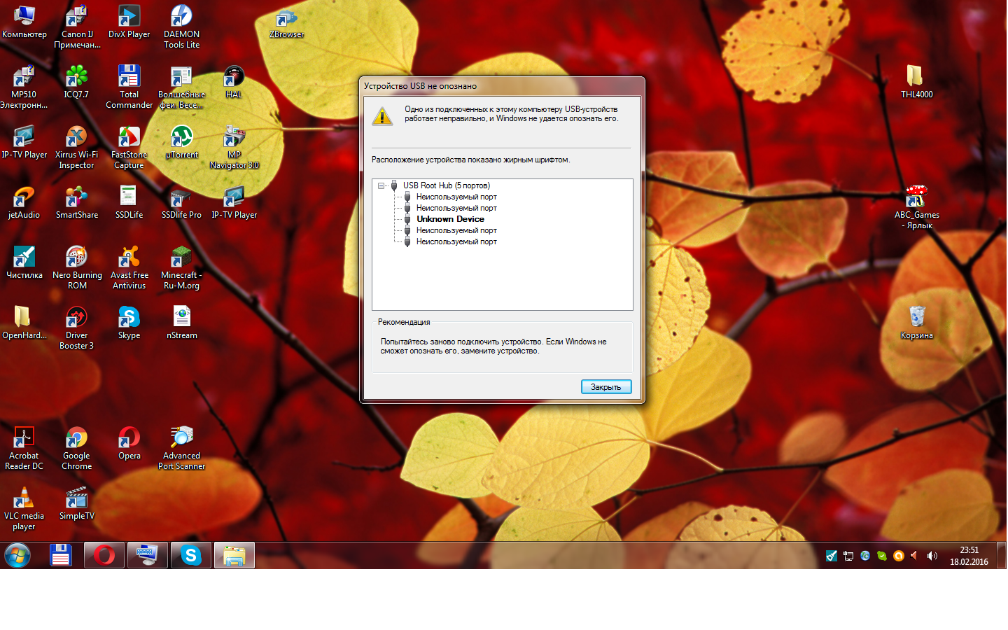 а зачем ты его через хаб подключаешь? скорее всего в этом и проблема, подключай в порт выведенный непосредственно на материнской плате