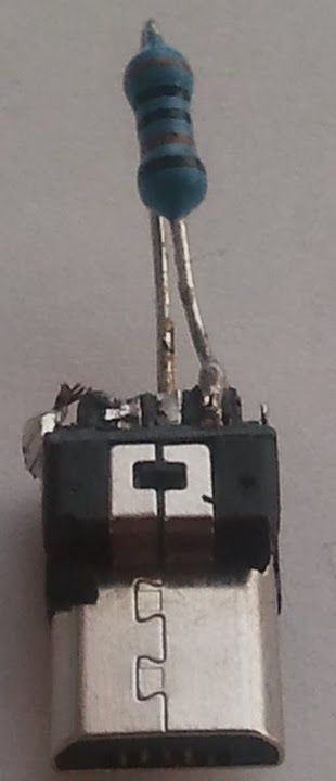 Для этого: купите micro-USB штеккер тип B, либо кабель с таким штеккером. Внимание!! проверьте, что контакт 4 в кабеле подключен. В некоторых кабелях он не используется. Далее, вам понадобится резистор с сопротивлением 301 ком (можно использовать два резистора включенных последовательно 300Ком + 1Ком). Желательно использовать резисторы с минимальным допуском (чем точнее, тем лучше).