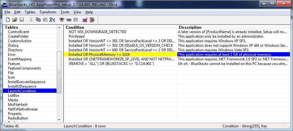 LaunchCondition удалить строчку