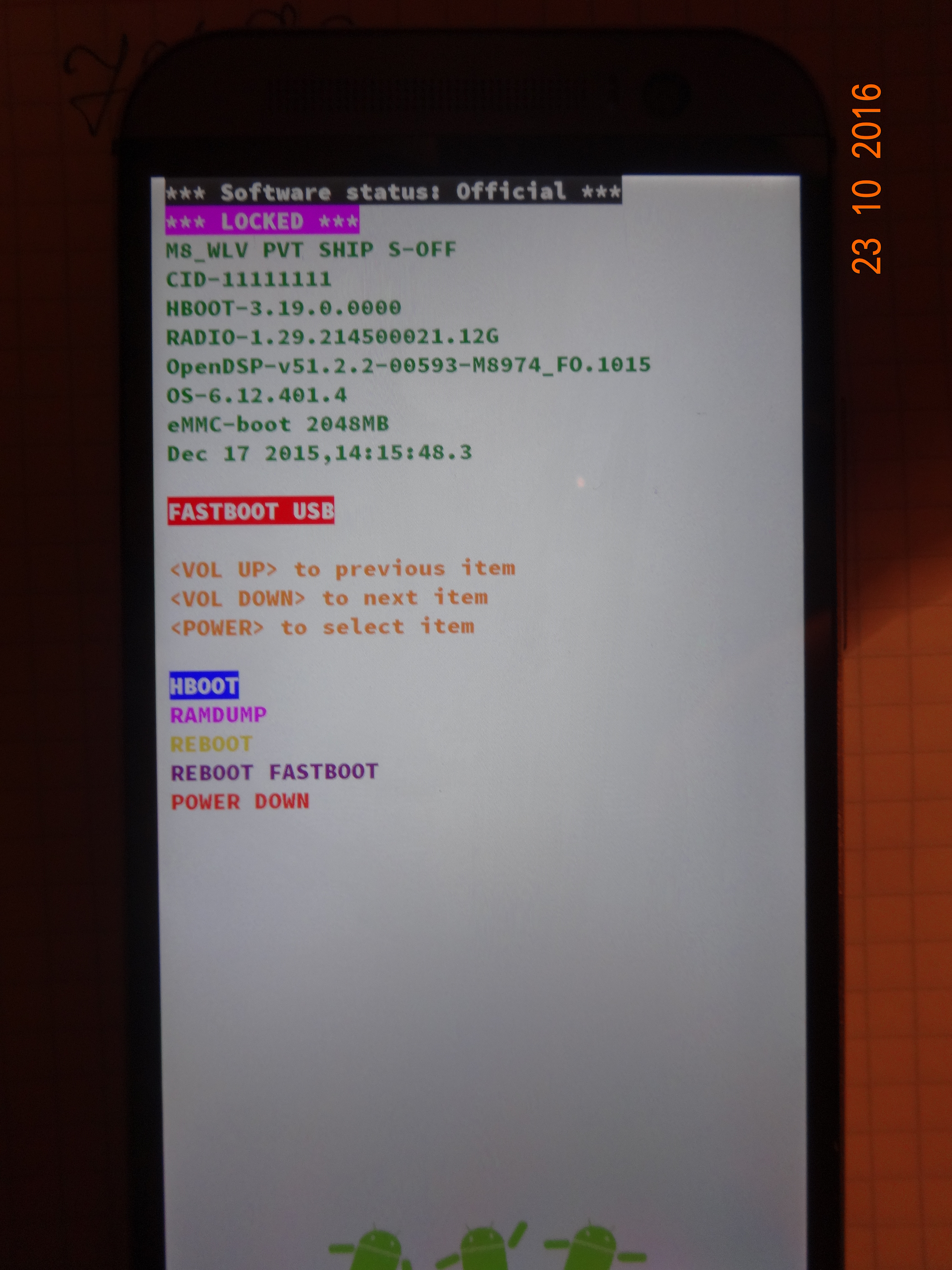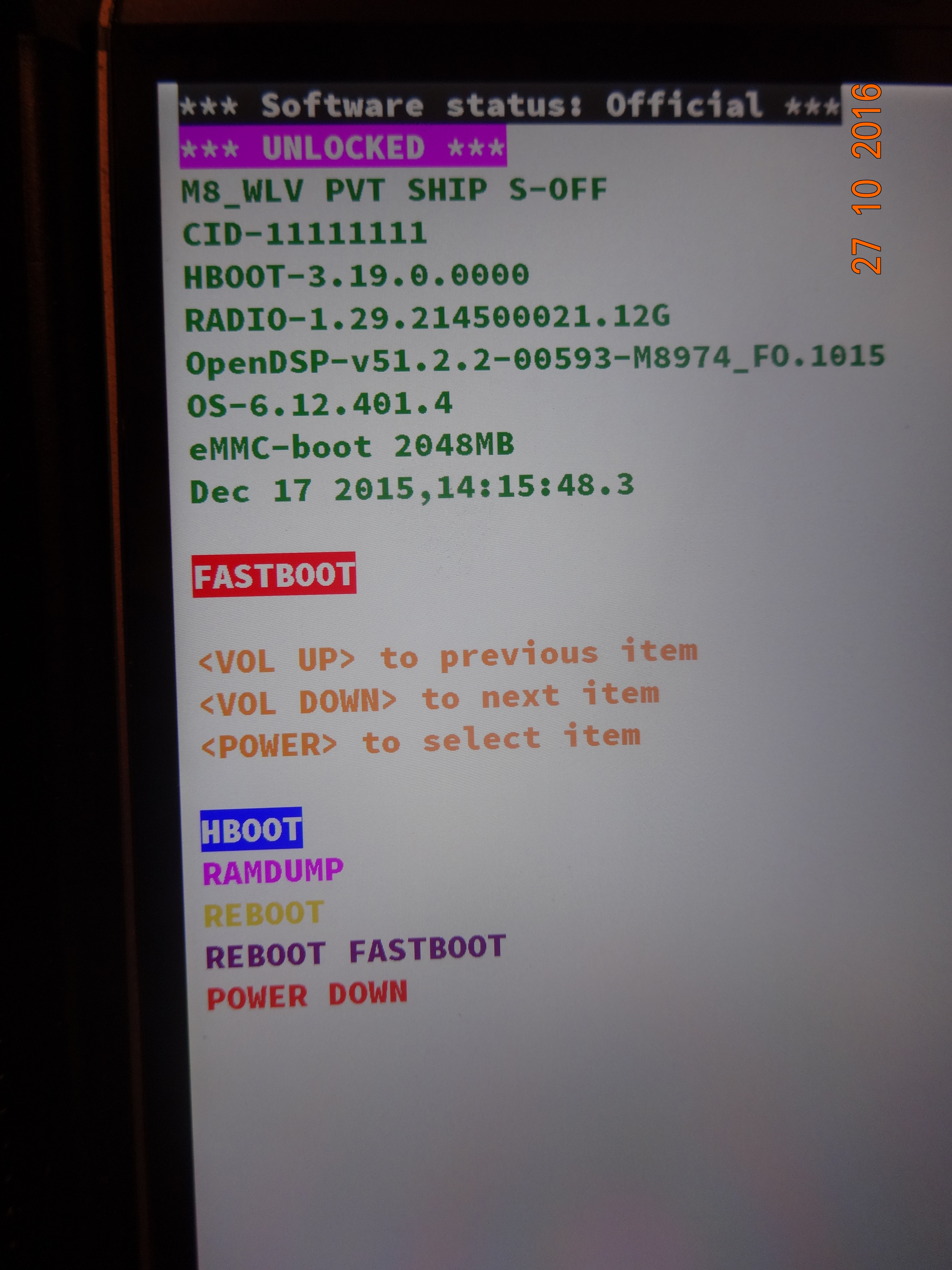Купил через интернет. Решил прошить. S-OFF был и всё остальное. Прошивка firmware с изменённым android-info.txt .MID был изменён на 20000. Теперь загрузка только Bootloader. Ставил прошивку HTC_One_(M8)_-_MaximusHD_12.0.0 всё устанавливается до конца но перезагружаю и опять бутлоадер . (bootloader) version: 0.5