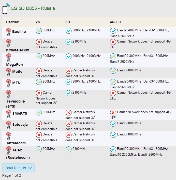 LTE 700 / 800 / 900 / 1800 / 2100 / 2300 / 2600 - D855
