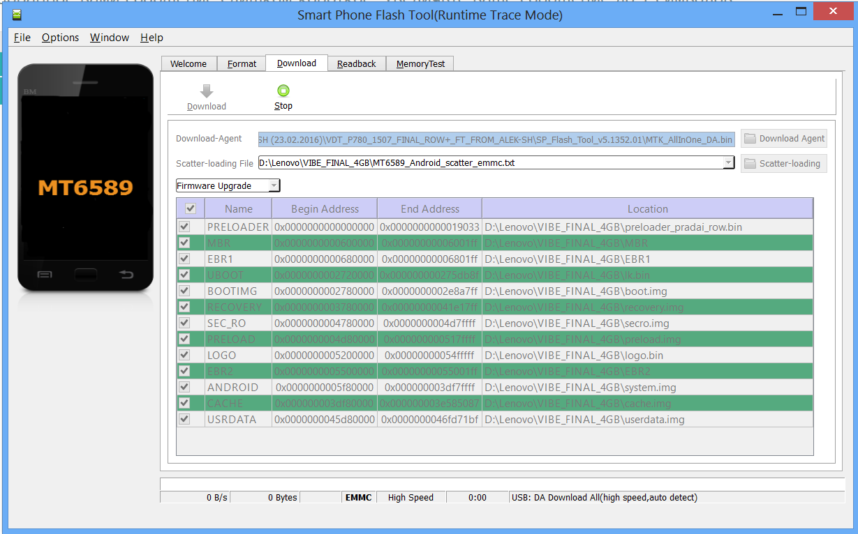 Отсоединил аппарат. Запустил Flash Tool. Версия SP_Flash_Tool_v5.1352.01 была в комплекте с прошивкой. Прошивка VDT_P780_1507_FINAL_ROW+_FT_FROM_ALEK-SH. Открылось окно Flash Tool. Нажал на Scatter-loading и выбрал txt файл. На против всех прошиваемых img файлов стояли галочки. В выпадающем меню выбрал Firmware Upgrade. И нажал Download (картинку под спойлер, к сожалению, разместить не удалось) (рис.1).