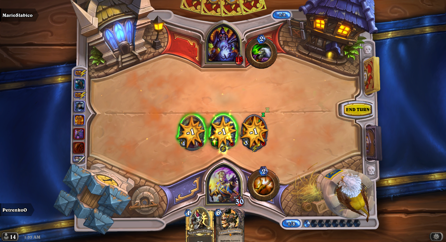 1:2, вылет в четвертьфинале. Жаль, последняя зона перед призами. Почти весь турнир играй первой колодой и после первого луза zoo-warlock'у маклера сменил на такую. Маназмеи ни разу не пришли в руку
