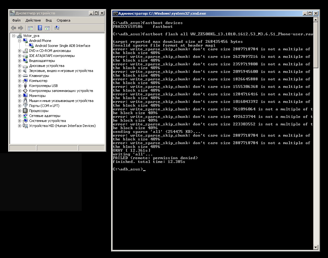 А что после этого можно сделать? Извините, у меня почти та же проблема (ZE500KL), за исключением ошибок при работе в ASUS Flash Tools. Сам процесс прошивки завершается корректно, однако тел не загружает ничего, кроме начальной заставки. Ну и в остальном так же: в fastboot вхожу, стоковый рекавери поставил через «Minimal ADB and Fastboot», перепрошил «WW_ZE500KL_V12.8.5.222_M3.6.42_Phone-user.raw.zip», но тел при перезагрузке в заставке.