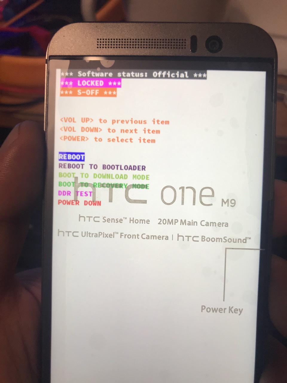 4.перезагрузите девайс в download mode. Для этого долго жмём кнопку Power, выбираем Перезапуск и тут же зажимаем и держим VolDown. Как только появится логотип HTC на тёмном фоне - отпускаем кнопку.