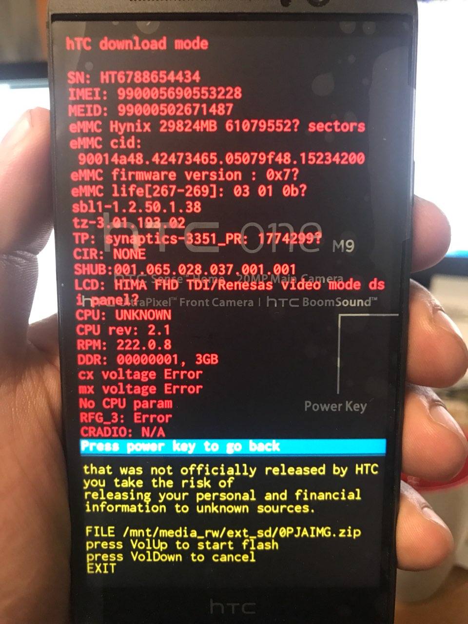 Посмотрев даные о телефоне я увидел что имеи и серийный номер те же а радиомодуль 4.00.С1310411@70106 а был 3.00.С1144084@60114 Но и я решил прошить вот эту пару - сначала фирмваре потом руу (3.41.651.4 Full Signed Firmware from OTA (fastboot flashable) и 0PJAIMG_Sprint_HTC_One_M9_3.41.651.4_RUU.zip). Такая у меня версия андроид была сначала (3.41.651.4). Все делал по инструкции все прошилось. ПИсало загрузка андроид из 14 и все белый фон а на нем htc.