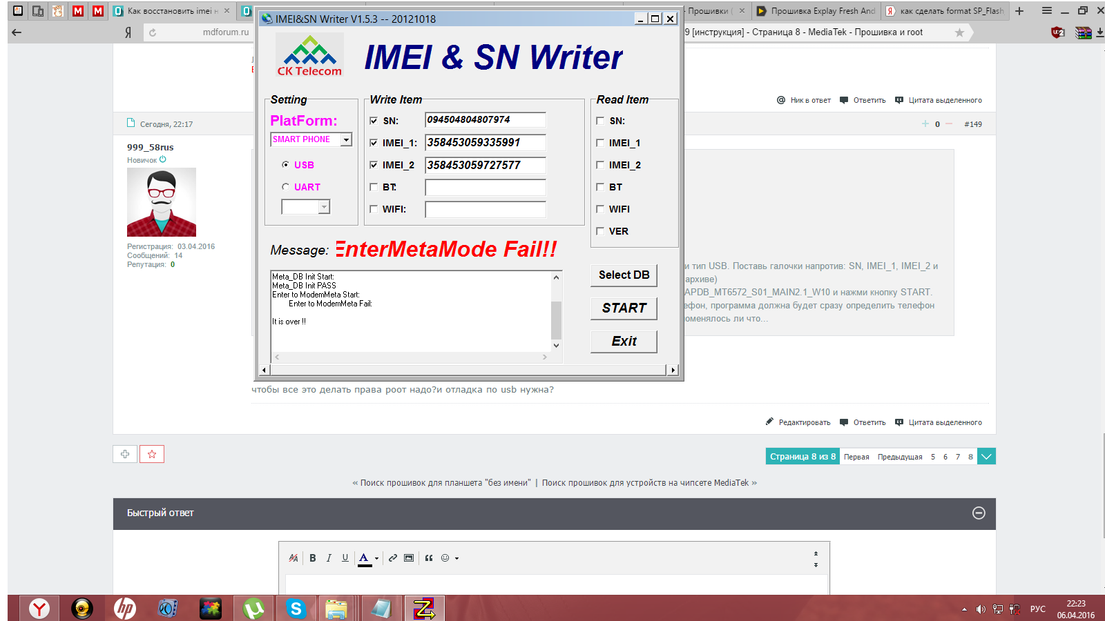 3. Запусти IMEI&SN Writer (всё найдёшь в архиве). В настройках PlatForm выбери SMART PHONE и тип USB. Поставь галочки напротив: SN, IMEI_1, IMEI_2 и впиши напротив свои данные (серийник и имеи). Затем выбери в начале файл (файлы тоже есть в архиве) BPLGUInfoCustomAppSrcP_MT6572_S00_MOLY_WR8_W1315_MD_WG_MP_V1_P9_1_2g_n и потом APDB_MT6572_S01_MAIN2.1_W10 и нажми кнопку START. Далее важно! не отключая телефон от ПК достань батарейку и вставь обратно, затем включи телефон, программа должна будет сразу определить телефон в метамоде и внести изменения. Когда будет написано ОК - отключи телефон, включи и проверь поменялось ли что...