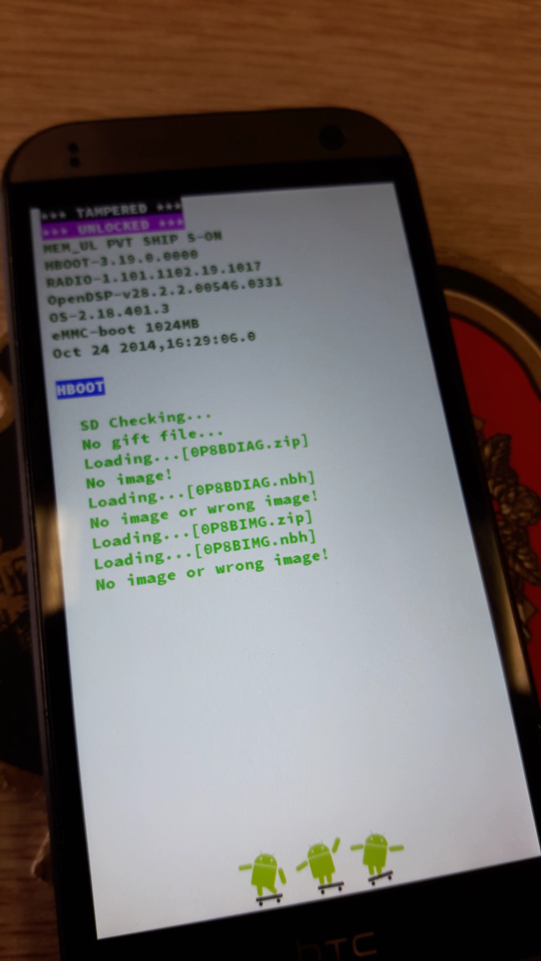 прошей стоковое recovery для своей версии фирмваре, закрой загрузчик и затем попробуй установить ruu прошивку с ПК, в теме где-то была ссылка, взятая на XDA, там целый репозиторий файлов был для HTC mini 2
