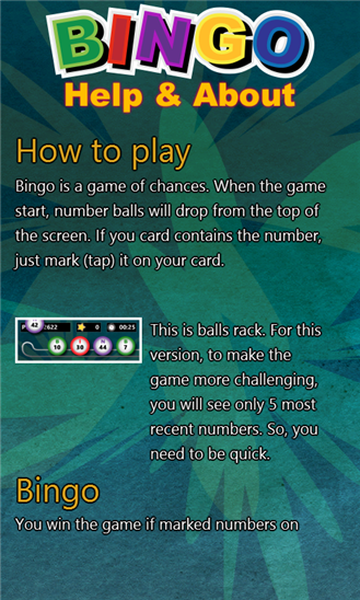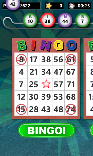 Bingo представляет собой классическое лото, в котором нужно отмечать на игровом поле цифры, а затем отмечать те, что выпадают случайным образом. Если у вас первого совпадут все цифры, вы победили. Игра довольно лёгкая, но увлекательная.