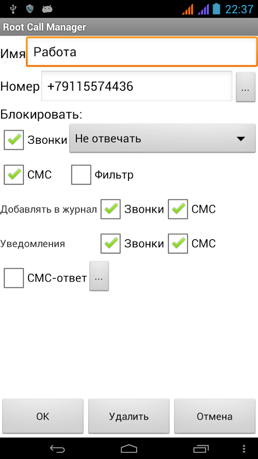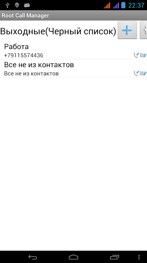 Программа позволяет блокировать нежелательные звонки и СМС. Для функционирования необходимы права root. Имеется поддержка двухсимочных смартфонов. Блокирование осуществляется на системном уровне, программа не пропускает первый звонок, не зажигается экран и не появляется окно диалера. Для звонков можно выбрать способ блокировки "Сбросить" или "Не отвечать". Для СМС при желании можно задать фильтр по тексту(если фильтр не задан, то блокируются все СМС с указанного номера).