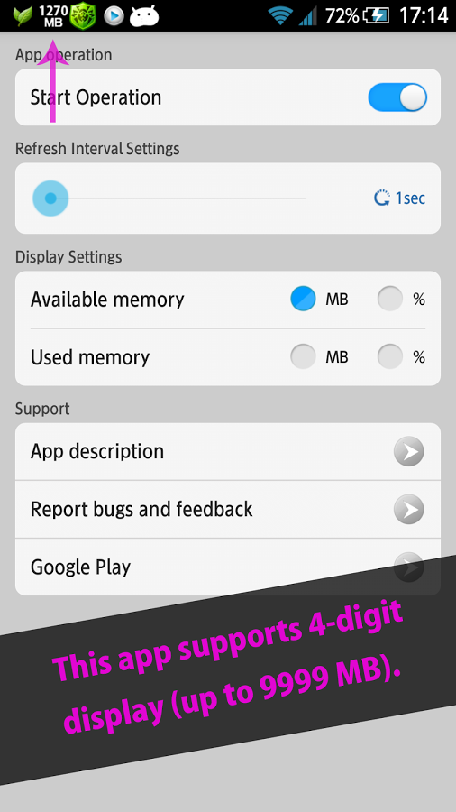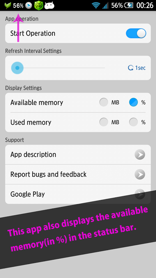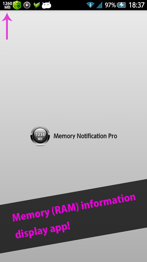 Memory Notification Pro - приложение, которое отображает доступный размер памяти или свободной памяти (в%) или размер используемой памяти или занятой памяти (в%) в строке состояния.
