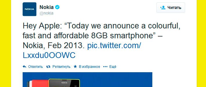 «Эй, Apple: „Сегодня мы представляем яркий и доступный 8-гигабайтный смартфон“ — Nokia, февраль 2013 года», — гласит комментарий к изображению. Как отмечает phoneArena, WP-смартфон финской компании имеет дисплей с такой же диагональю, как у iPhone 5c, предлагается также в разных цветах и с тем же объемом накопителя. Стоит он при этом во много раз дешевле конкурирующего аппарата.