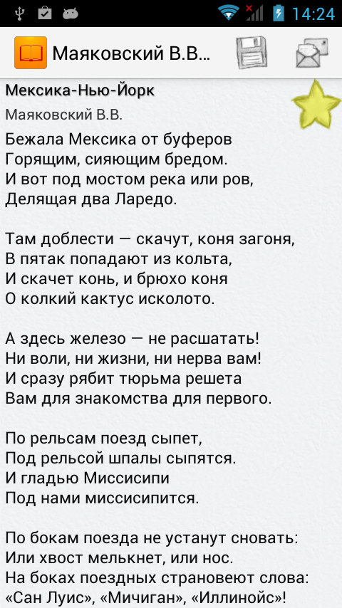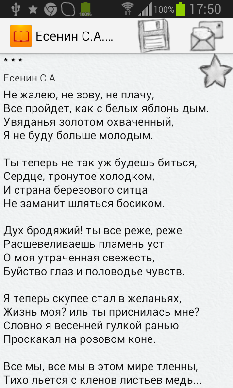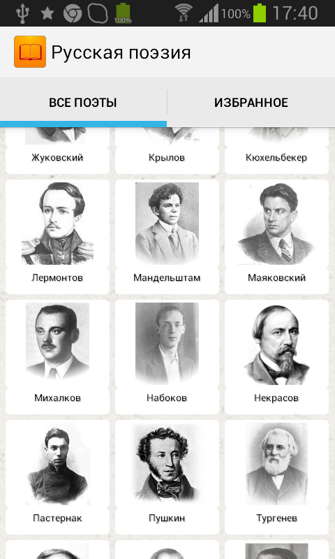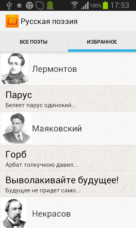 Сборник более 1500 стихотворений великих русских поэтов 19—20 веков. Стихи доступны без доступа к Интернету, предварительное скачивание не требуется. Есть удобная функция закладок для любимых стихов