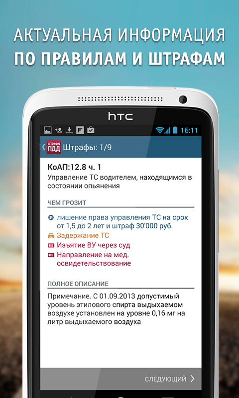 - Удобный ГОЛОСОВОЙ ПОИСК штрафов (знак микрофона в верхней части экрана): нажимаете на микрофон, проговариваете, например, "алкоголь" и получаете список штрафов, которые можно получить за вождение в состоянии алкогольного опьянения