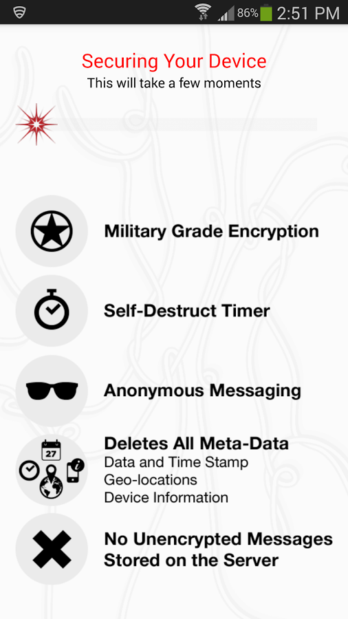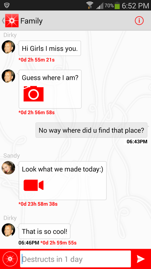 Сообщения автоматически удаляются после определенного временного периода. Пользователи могут самостоятельно определить через сколько секунд, минут или часов отправленная информация удалится с аппарата адресата.