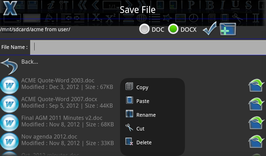 Офис для Андроид с возможностью чтения и редактирования файлов MS Word ( .doc , .docx , .rtf , .xml), MS Excel ( .xls , .xlsx), MS PowerPoint (.pptx), текстовых файлов, файлов XML и CSV.