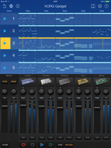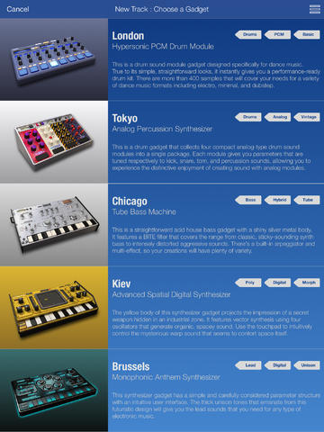 KORG Gadget предлагает коллекцию из 15 различных синтезаторов и драм-машин под названием "Гаджет", которые вы можете свободно объединять, чтобы произвести мощную электронную музыку.