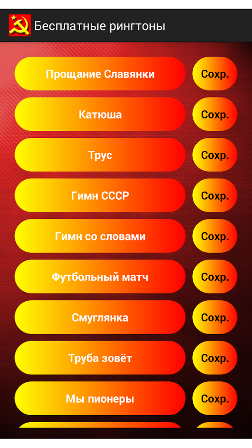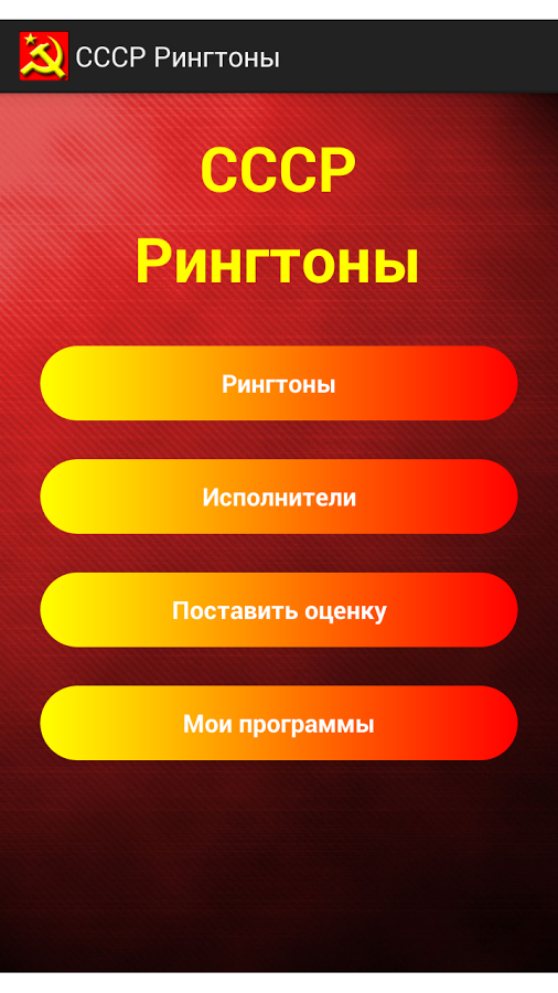 Внимание! Первое приложение - рингтоны СССР. Мы сделали рингтоны СССР для Вас! Топ рингтоны, самые популярные в СССР. Для Вас бесплатно!