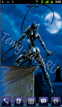 Тема с двумя героями вселенной DC: Женщиной-кошкой и Бэтмэном, сделанная в фиолетовых тонах для смартфонов на Андроид