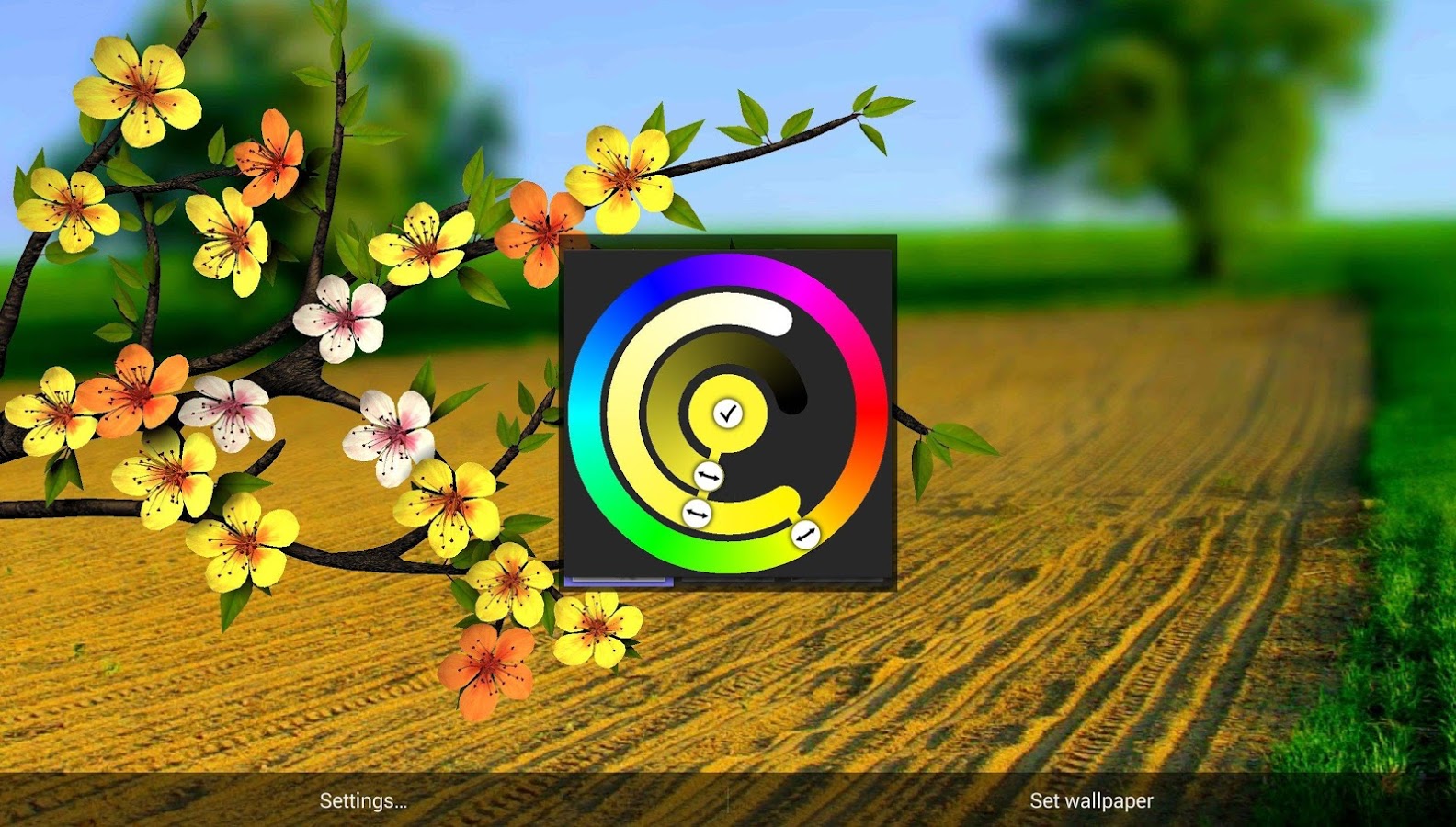 Весенние живые обои для вашего Android устройства. Вы можете сменить тип ветки и цветов на ней (доступно три вида), поменять фоновый рисунок из предложенных автором или выбрать свой, установить максимальное качество картинки если смартфон у Вас топовый и конечно же перекрасить все цветочки в свои любимые цветовые решения.