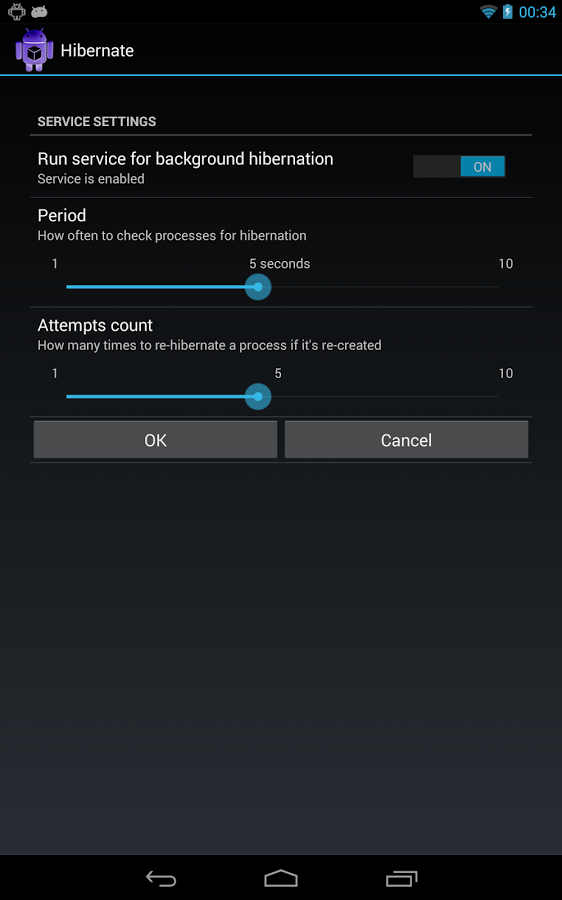 Программа работает в режиме службы с запуском при старте Андроид и автоматической гибернацией списка процессов в фоне. Будьте осторожны: режим службы может разрядить батарею, если в списке гибернации указаны процессы, которые постоянно воссоздаются сами собой.