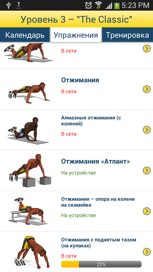- Список с каждым упражнением который составляют тренировку. Каждое упражнение иллюстрируется с видео.