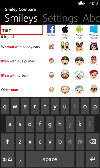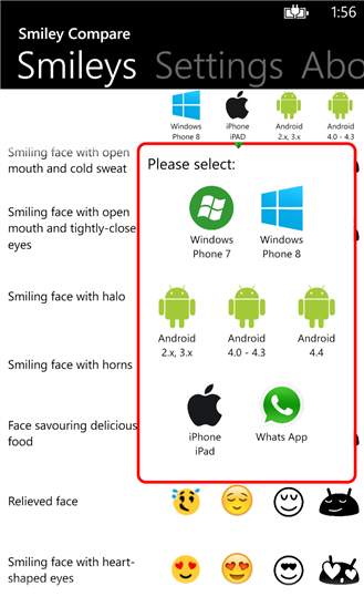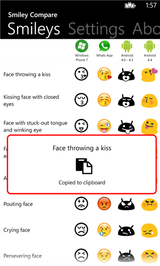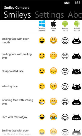 Сравните внешний вид смайлики разные смартфоны и социальных платформ. Если вы когда-нибудь задумывались, как смайлик выглядит на других смартфонах, получить этот App и узнайте. Все смайлики, дословно описаны выяснить смысл inteted. Можно скопировать и вставить любой смайлик в буфер обмена и его легко использовать в других приложениях - просто нажмите на него. Кроме того, вы можете искать по описанию найти Симли, которую вы хотите.