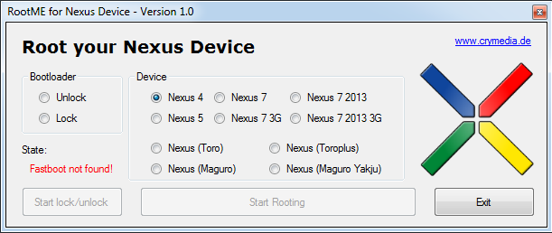 RootME - утилита, которая поможет получить рут-права в один клик на вашем Nexus устройстве. Необходимо только подсоединить ваш телефон/планшет в режиме Fastboot и нажать на кнопку Start Rooting.