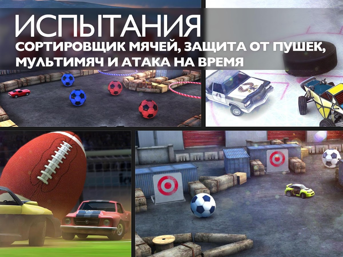 Готовьтесь к турнирам, оттачивая свое мастерство в Академии. Здесь можно узнать предел своих навыков благодаря таким интригующим испытаниям, как «Мультимяч», «Сортировщик мячей», «Защита от пушек» и «Атака на время». Доказывайте, что вы лучший, бросая вызов друзьям с помощью режима многопользовательской игры на одном устройстве, который позволяет превратить ваш смартфон или планшет в жаркую футбольную арену для двух автомобилей.