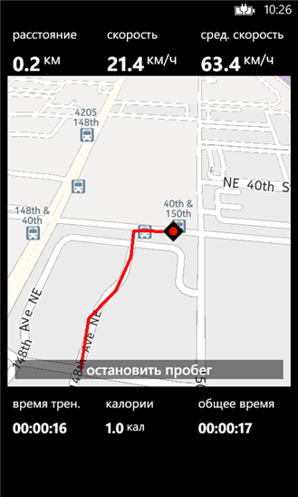 - Записывает данные о Вашем пробеге, включая среднюю и максимальную скорость, время упражнения и сколько калорий Вы затратили.
