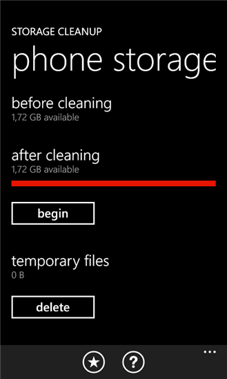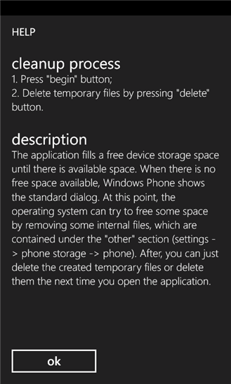 С помощью приложение вы сможете очистить оперативную память телефона. Когда нет свободного места, windows phone показывает стандартное диалоговое окно о не достатке места, теперь вы можете её очистить путём перемещения некоторых файлов в другой раздел.