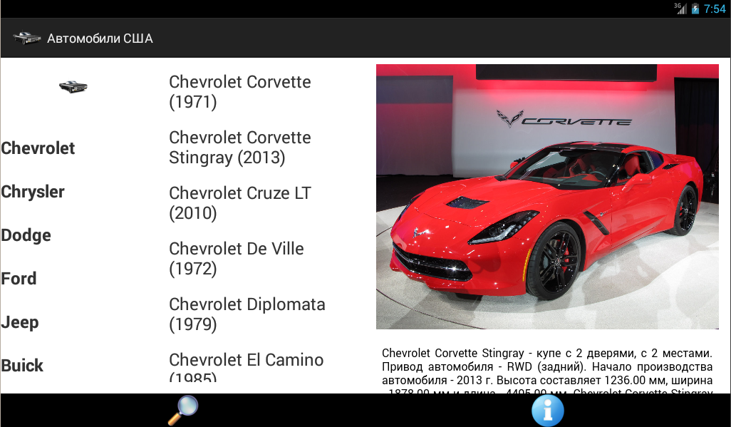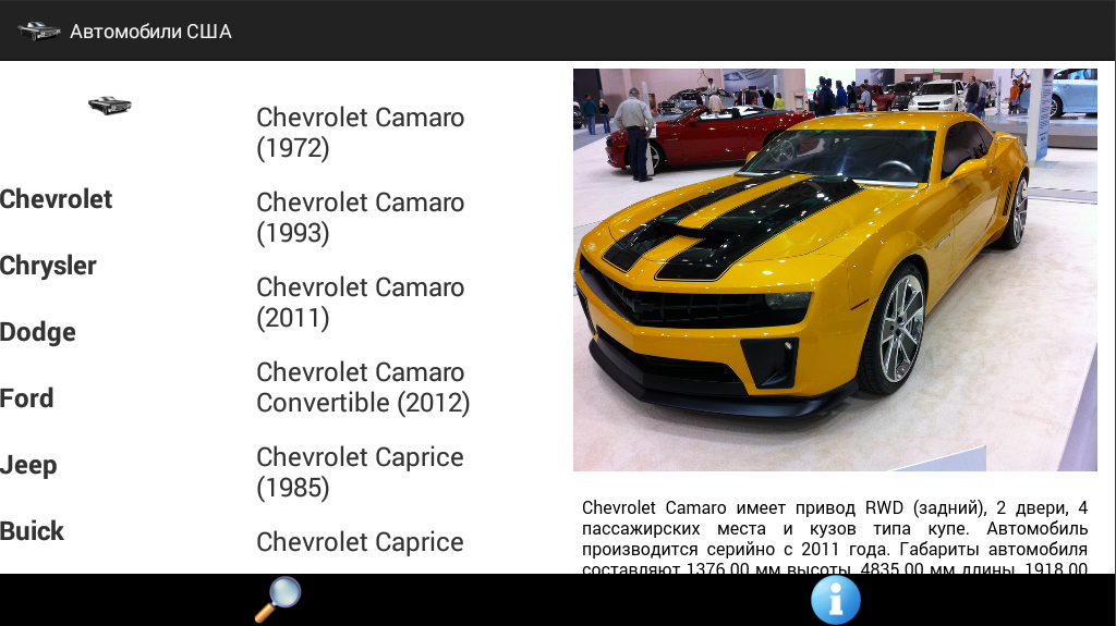 Это приложение для всех любителей и поклонников автомобилей, производимых компаниями США. В приложении представлены такие американские марки машин как Chevrolet, Chrysler, Dodge, Ford, Jeep, GMC и другие. Представлены как фотографии машин, так и их характеристики. Для удобства поиска по моделям, все сгруппировано по производителям, что позволяет быстро найти все интересующие вас модели. Для более удобного и гибкого поиска также имеется поиск по названию марки или модели. Приложение адаптировано для планшетов, поэтому на больших экранах весь функционал будет у вас под рукой. Приложение может работать без подключения к интернету. В таком случае вам будут доступны все данные, кроме больших фотографий автомобилей.
