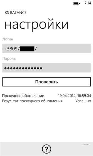 Приложение использует систему "Мой Киевстар", что бы получить текущий баланс и отобразить его на живой плитке. Внимание! Обновление происходит автоматически раз в 20-25 минут, это контролируется системой Windows Phone и не может быть изменено.