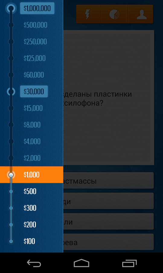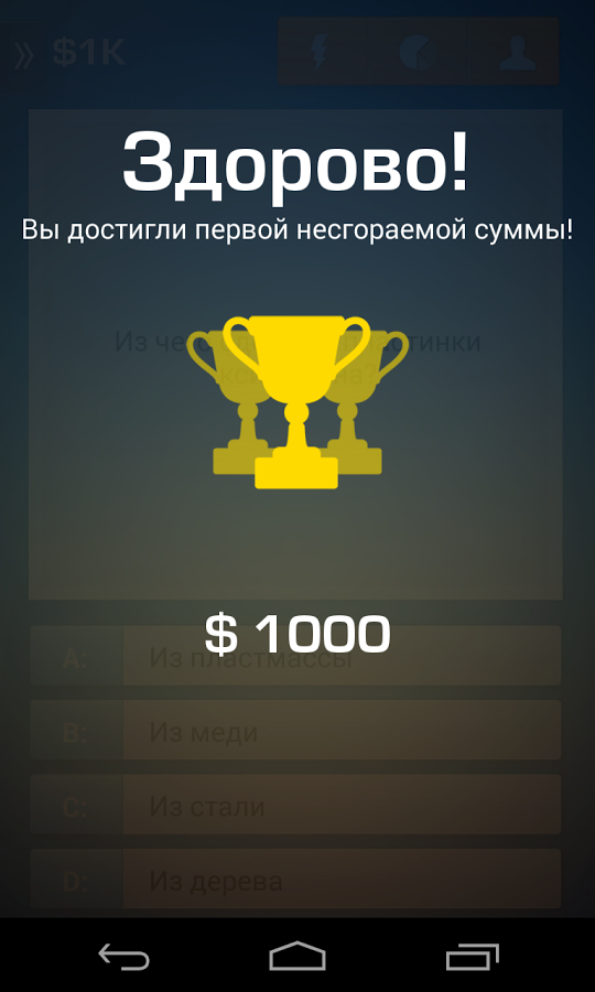 Игра по мотивам известного шоу "Кто хочет стать миллионером" ("О счастливчик"). 15 вопросов, 4 варианта ответа, 2 несгораемые суммы, 3 подсказки и $1 000 000