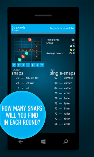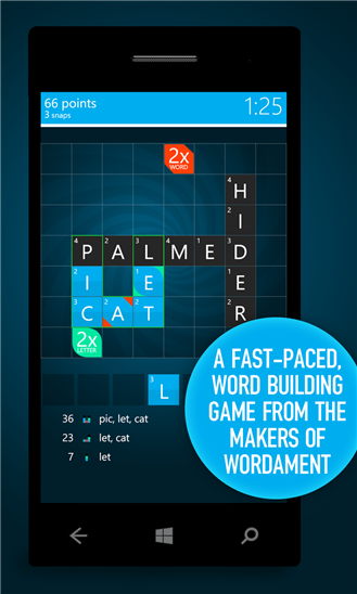 Ремейк Wordament от Microsoft Studios. Как и Wordament, Snap Attack являет из себя игру с глобальным мультиплеером, где пользователям за определенное количество времени нужно собрать как можно больше слов. В самом начале раунда на таблице вам отображаются уже существующие слова и ряд букв. Используя эти буквы, вы должны составлять другие слова, в сочетании с буквами из слов на поле. Чем больше слов, чем больше в них букв, тем больше баллов вы в результате получите.