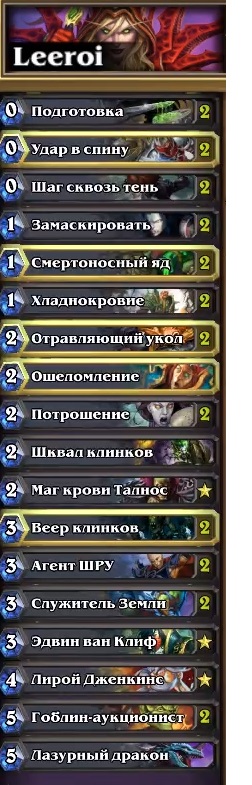 Leeroy Jenkins x1 – Основная карта в данной колоде. Без нее играть очень сложно, хотя я зачастую выигрываю и без нее. Используем как финишер, комбим с хладнокровием и шагом сквозь тень.
