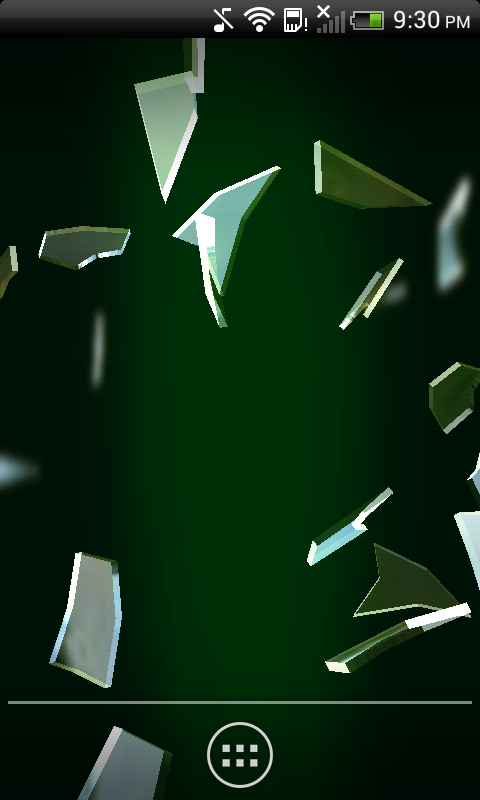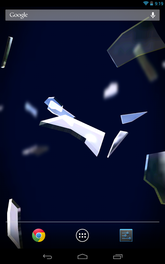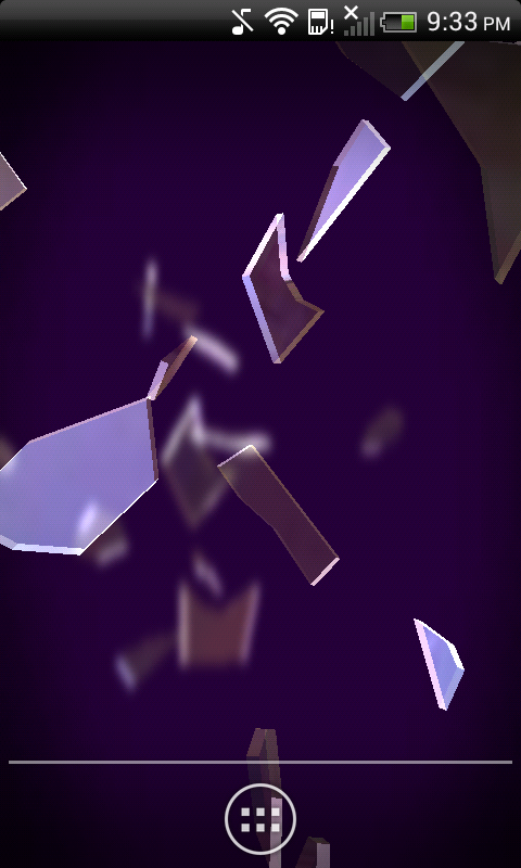 Живые обои изображают множество осколков стекла, парящих в воздухе. Осколки медленно кружатся и двигаются, следуя за сменой рабочих столов.