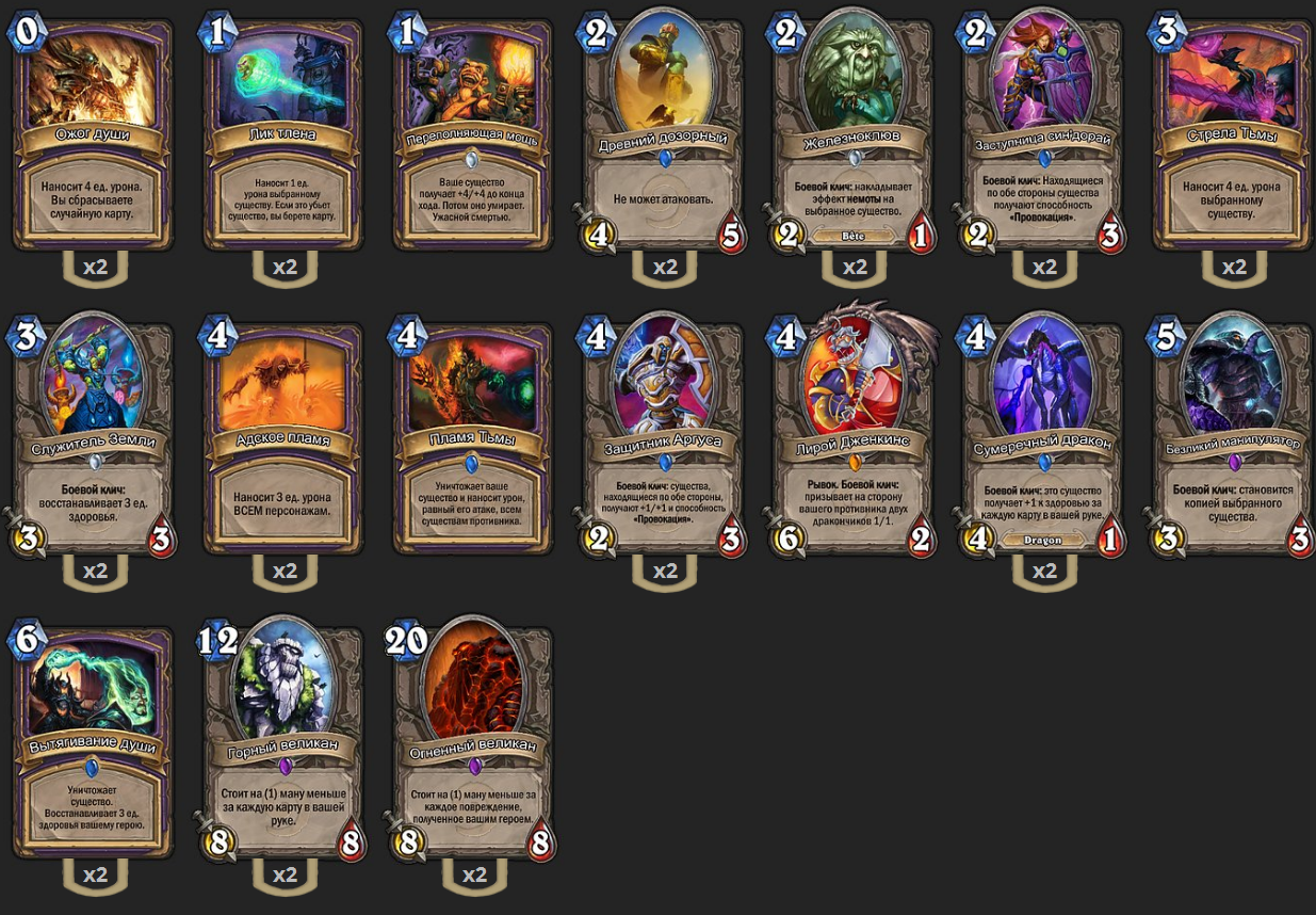 Переполняющая мощь – тут все просто, используем для нанесения летала, хорошо работает комбинация Лирой + Переполняющая мощь + Манипулятор = 20 урона. В редких случая лучше кинуть на свою кричу, чтобы разменяться, чем использовать ожог души и итоге получить шанс лишиться обеих карт.